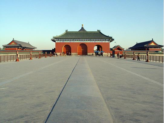 天坛是明清时期最大形制的皇家祭坛,以其严谨的建筑布局、奇特的建筑构造和瑰丽的建筑装饰著称于世。主要建筑物在内坛,南有圜丘坛、皇穹宇,北有祈年殿、皇乾殿,由一条贯通南北的甬道--丹陛桥,把这两组建筑连接起来。外坛古柏苍郁,环绕着内坛,使主要建筑群显得更加庄严宏伟。坛内还有巧妙运用声学原理建造的回音壁、三音石、对话石等,时时显示着古代中国建筑工艺的发达水平。