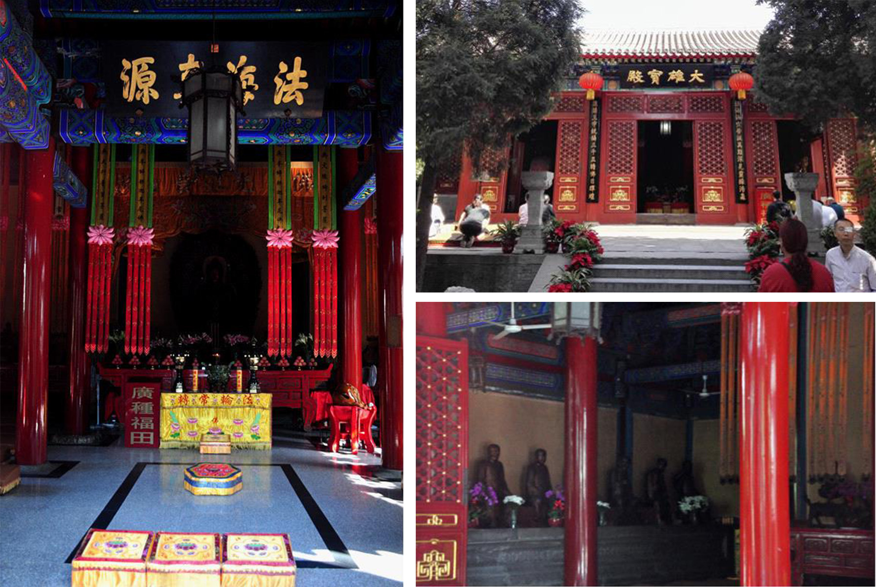 第二进院落的主殿是大雄宝殿,又称“大殿”,即“正殿”。这是法源寺僧众诵经、举行重大佛事活动的主要殿堂。面阔五间,前出抱厦三间。它是寺内最主要的建筑,檐下绘制了金龙和玺彩画,抱厦梁架上悬挂着乾隆帝御书的“法海真源”匾额。殿前有明清石碑六通,记述了修寺的历史经过。殿内正中供奉着明初制作的毗卢舍那佛、文殊菩萨、普贤菩萨像,合称“华严三圣”像。与“华严三圣”平行的,左侧供药上菩萨、无尽意菩萨、药王菩萨像,右侧供观世音菩萨、大势至菩萨、弥勒菩萨像,与文殊、普贤一起,又合称为“八大菩萨”。此外,在大殿的两厢还分列着清代木雕的十八罗汉像。