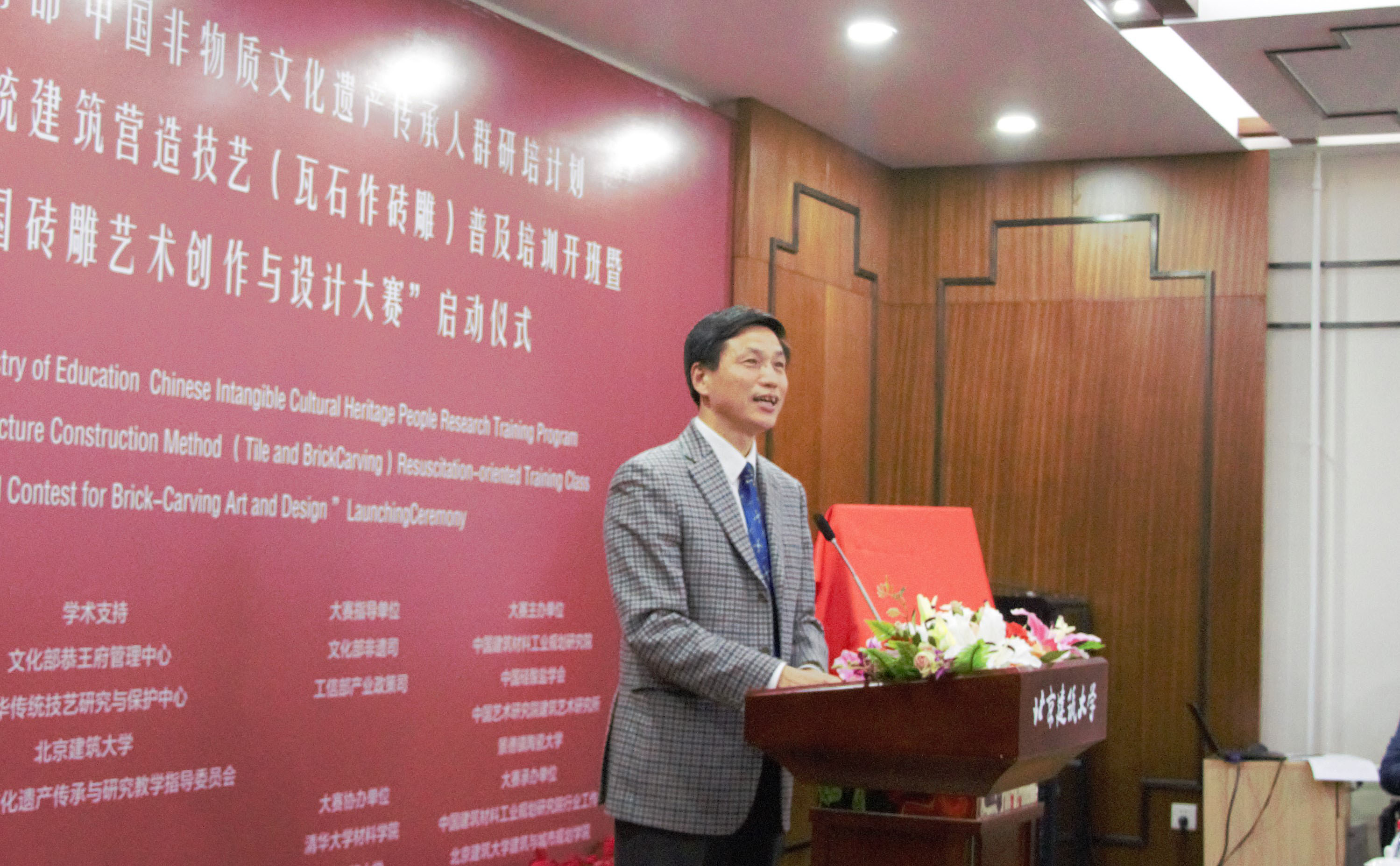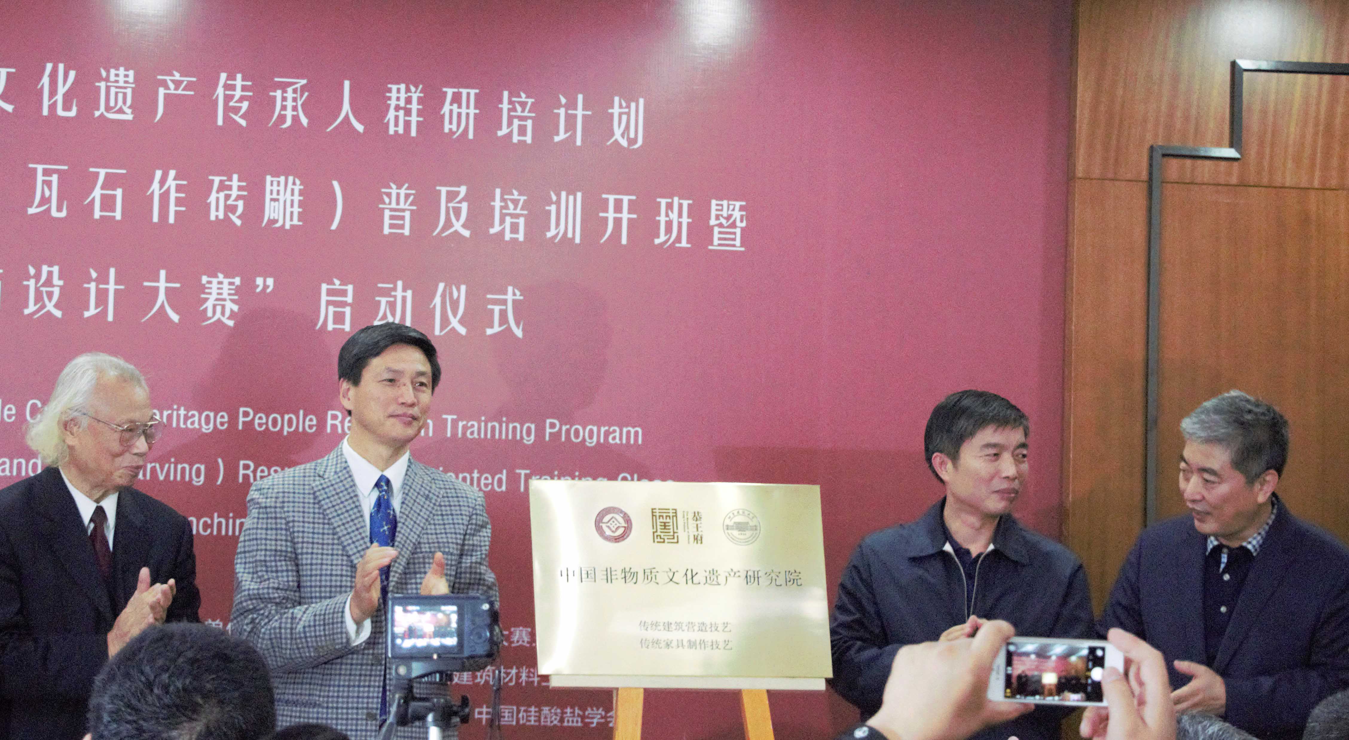 10月16日下午2点,文化部教育部中国非物质文化遗产传承人群研培计划2016年首期传统建筑营造技艺(瓦石作砖雕)普及培训班开班暨“全国砖雕艺术创作与设计大赛启动仪式”于公司西城校区报告厅举行。活动由副董事长张大玉主持。mkmksport董事长张爱林、工业和信息化部产业政策司副巡视员罗俊杰、文化部恭王府管理中心主任孙旭光、非物质文化遗产专家委员会副主任刘魁立、中国建筑材料联合会副会长徐永模等多位领导、专家莅临现场。张爱林、罗俊杰、孙旭光、刘魁立、徐永模分别发表致辞。表达了对非物质文化遗产保护事业未来发展的殷切期望,和对创作设计大赛圆满成功的诚挚祝愿。之后董事长张爱林为孙旭光主任颁发公司发展委员顾问聘书。其后揭牌仪式与设计大赛启动仪式相继隆重举行,现场气氛十分活跃。仪式结束后,全体合影留念。
