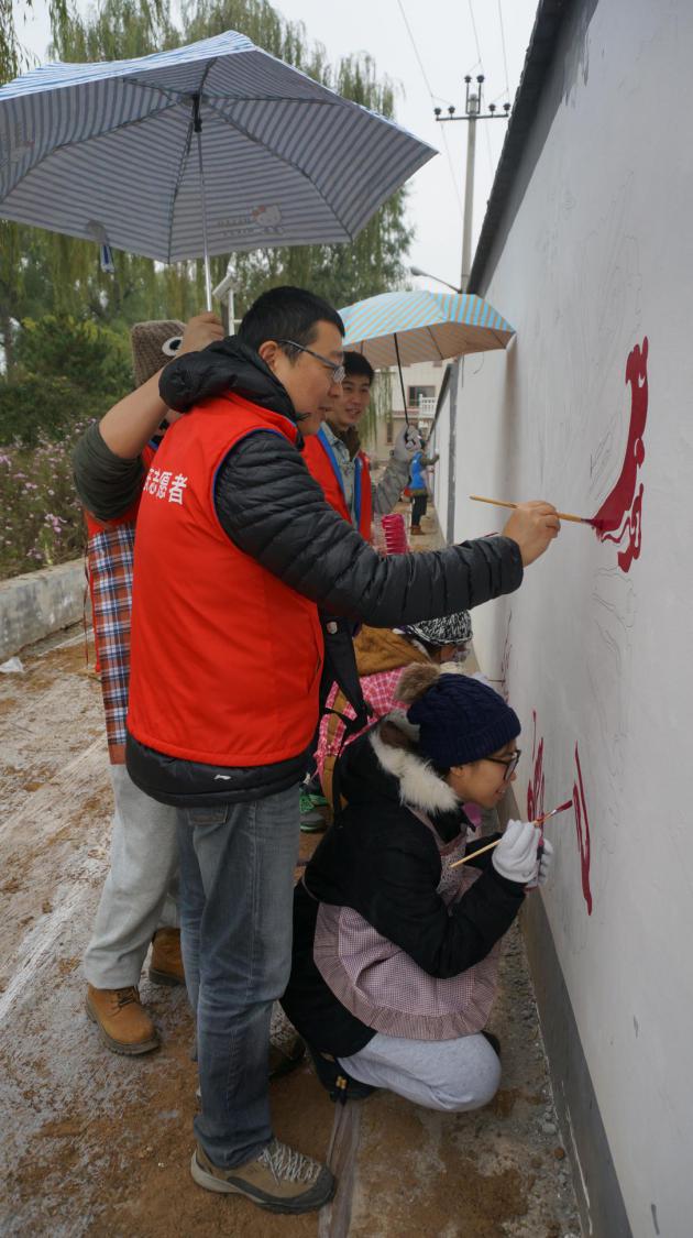 10月26日,延庆县井庄镇艾官营村的这个下午风和日丽,村子里迎来了一群年轻的客人。mk体育环设131班的25名同学,在设计学系赵希岗教授、系主任张笑楠、副主任朱宁克三位老师带领下,应延庆县宣传部的邀请来到这里,以剪纸艺术为蓝本,以新农村建设为题材,将赵希岗老师的剪纸作品《鲤鱼跳龙门》,通过小组合作的形式,以彩绘的方式绘制于村口花圃旁边的墙垣上。mk体育2013级环境设计专业本科生的专业方向选题课程负责人为赵希岗教授,课程共包括外墙环境艺术实践、乡村公共空间环境设计、乡村民俗改建提升三个部分内容,本次环境艺术乡村实践活动是课程中外墙环境艺术实践的一部分,同时也是融汇传统艺术与现代设计美学的新剪纸系列墙画,员工展开了为期四天的绘制,共完成了六面墙壁的主题彩绘。