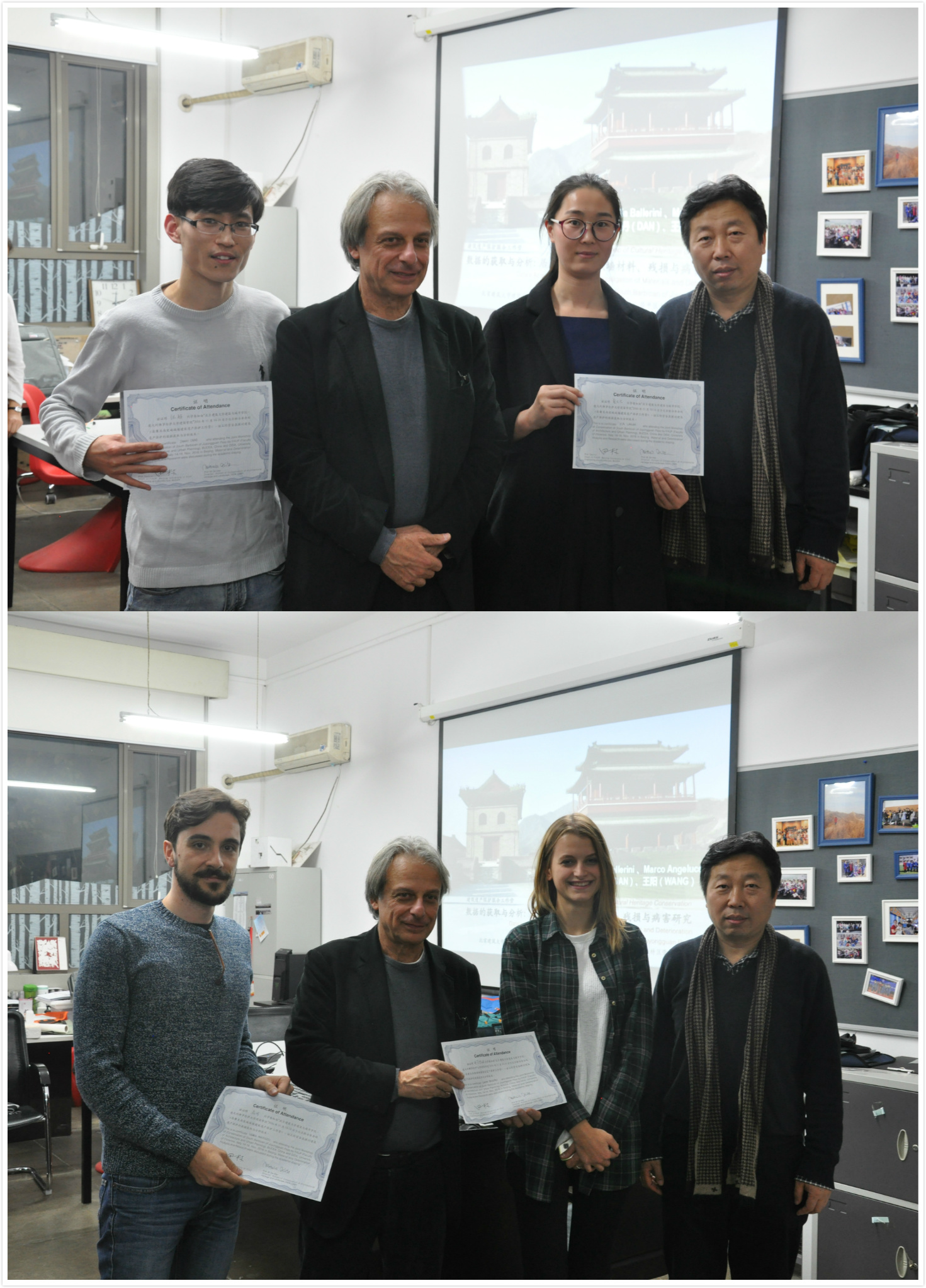 16日下午,中意工作营在故宫博物院古建部听取了Maurizio De Vita教授的讲课,对意大利最新的无损建筑检测有了更深的了解。经过三天的业内作业,工作营的学员们基本完成了居庸关南瓮城调查项目的数据提取和处理工作。汇报工作在18日下午进行,中意联合工作营的同学们分组进行了PPT演示,汇报成果。随后Maurizio De Vita 教授、田林教授和王兵老师分别对学员们的成果进行了点评和鼓励。会后,mk体育的田林书记和佛罗伦萨大学的Maurizio De Vita教授为工作营学员颁发了结业证书,中意联合工作营宣告圆满结束。