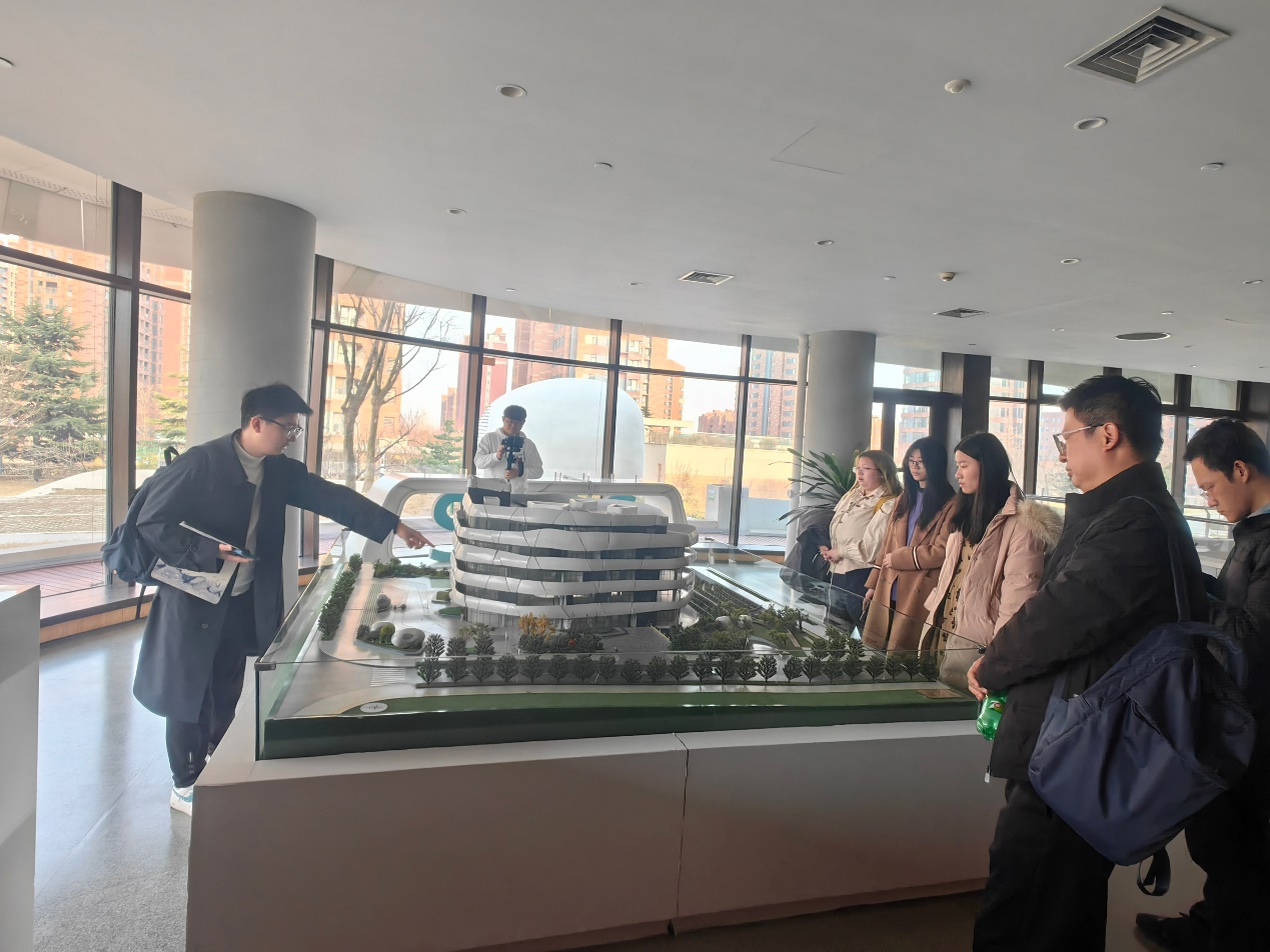 中德生态园由德国gmp公司规划设计,2010年在中德两国总理见证下签约建设,着力建设生态型、智能型、开放型的中德两国共建园区,被誉为中德两国政府间生态领域灯塔式项目。生态园管委会经理与团队为项目组师生详细介绍了生态园发展历程、总体规划及绿色理念等,同学们参观了大尺度规划模型和绿塔项目模型,与管理团队就建筑理念、绿建技术等相关问题进行了交流。