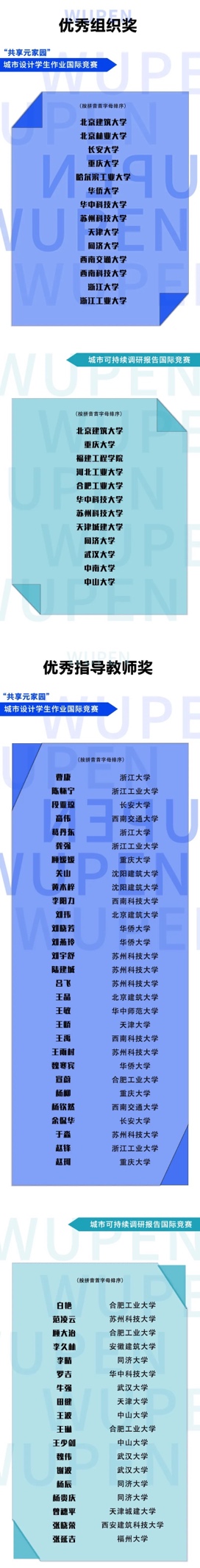 本届竞赛特别设置了优秀组织奖和优秀指导教师奖:获得一、二、三等奖总数前10名的院校组织将获评优秀组织奖;指导作品获一、二、三等奖总数前15名的教师将获评优秀指导教师奖。公司荣获城市设计员工作业和城市可持续调研报告双项优秀组织奖,公司教师王晶、刘玮获优秀指导教师奖。