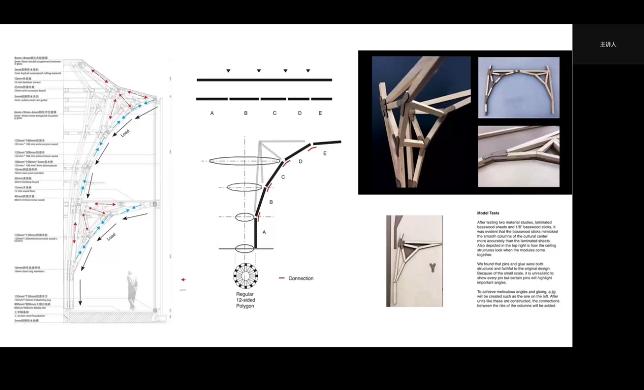 罗宇杰从真实性、普适性、可持续性三方面论述自身对结构的理解。以珑府生活体验中心、胜利市场临时安置点、元和观村党群服务中心、浙水村自然书屋、熟地博物馆、东庵上村儿童之家、无目的概念书店7个作品为案例,讲述他是如何以结构为线索,实现结构的功能与美学的有机统一。讲座过程中结合图片、视频等多种方式,生动地展示了作品的设计构思、建造过程以及建成后的使用现状,让观众们切实体会到了罗宇杰老师的设计魅力所在。在案例讲解过程中,也反映了罗宇杰老师关注可持续的建造方式,主张以更少的材料,去创造更通用的空间;推崇以自然材料进行建造,在木建筑领域进行了持续的研究和实践;探索如何更富创造力地解决社会问题,关注废弃场所、材料的更新再用,致力改善落后地区儿童的活动、学习空间;推进基于朴门永续理念下的生态农场组织和搭建,开展可持续理念下的建造营。