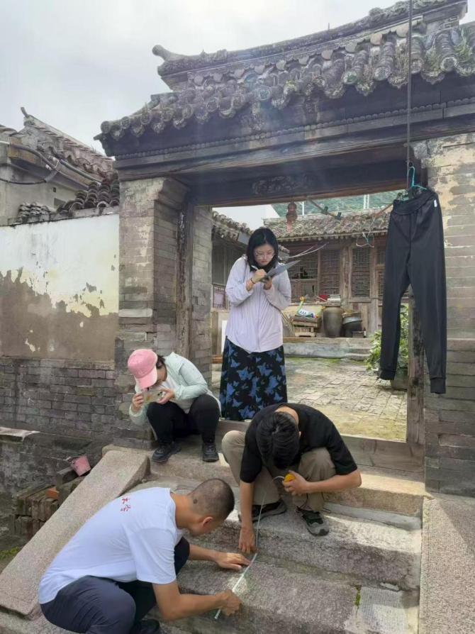 实践团兵分三路,每队均由教授带队,专业教师与辅导员辅助指导,硕博士研究生则牵头完成文物保护的基础性梳理工作。运用实地摄影、无人机航测与三维建模等手段,对重点文物、建筑、街道、环境等进行测绘,累计完成30余处历史建筑和院落的摄影建档,绘制完成3处明清古民居和2处城门楼的平立剖测绘图,记录遗产形制与特征。这不仅是“绘物”,更是为古堡留下了一份可再生的文化档案。