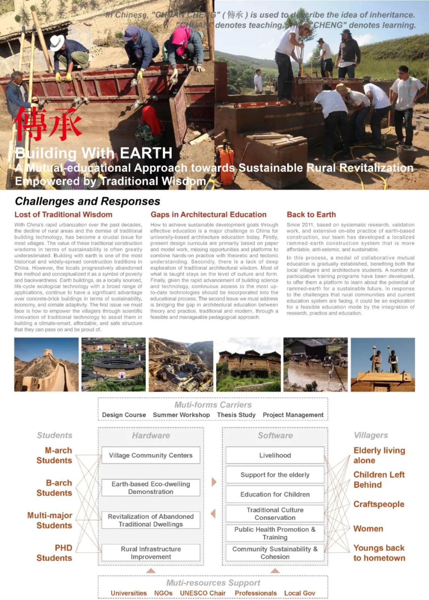 UIA建筑教育创新奖设立于2019年,面向全球范围内的建筑专业教育机构,旨在表彰跨文化、跨地域的多元化建筑教育创新,发掘有助于推动可持续发展、具有启发示范意义的教学实践。本届评审委员会基于“教学方法达到卓越水平”和“践行联合国可持续发展目标方面取得出色成就”两项评价标准,从全球五个UIA成员地区评选出4个高校项目授予创新奖,公司mk体育团队开展的“土生土长:基于传统传承的可持续乡村振兴与多元协同教育”项目荣获其中的一项。