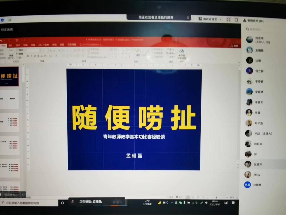 为了提高mk体育青年教师的教学能力,mk体育青年教师基本功比赛初赛结束后,公司于4月15日晚举办线上经验交流会,特别邀请第十三届北京市青年教师教学比赛一等奖获得者、建筑系孟璠磊副教授做了经验分享。公司党委书记何立新、教学副经理李春青以及十多位青年教师参加了会议。