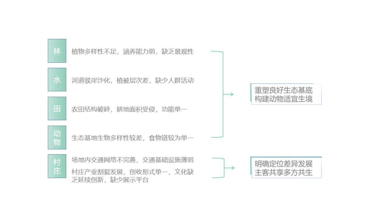 这些现象让设计小组对场地生态恢复的必要性产生了强烈的感触。于是小组在前期分析时着重进行了“林”、“水”、“田”、“村”以及“动物资源”进行了分析,总结凝练主要现状问题,从而进一步引导后期规划的方向。