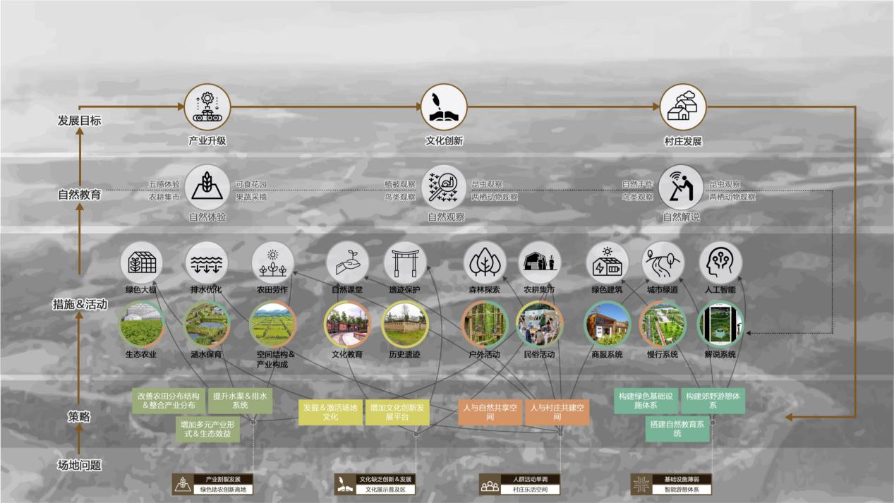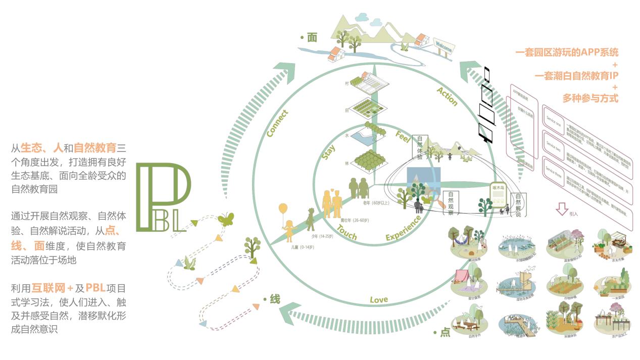 村庄节点我们以自然风光、传统民俗、节庆活动为特色,形成多点环绕的公共绿色开放空间。与场地内公司携手打造全龄自然教育课程,并将自然教育体系、康养体系、雨洪处理体系与场地紧密结合。