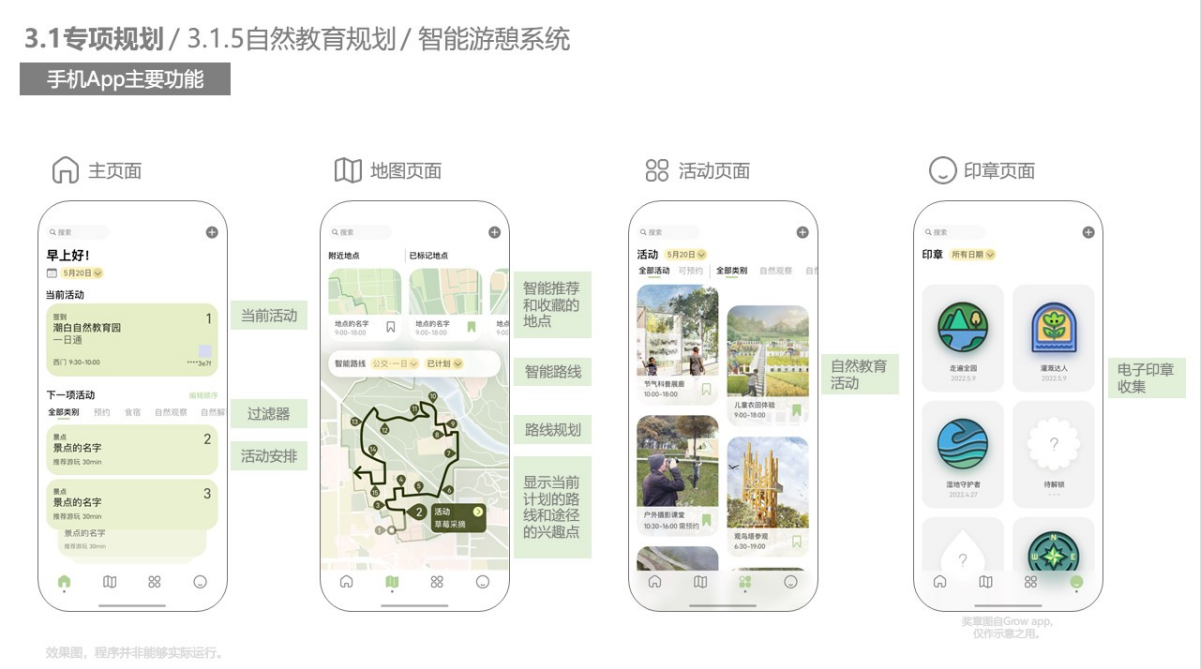 此外小组还对场地进行了更为详尽的专项规划,包括生态基底规划、鸟类生境规划、交通专项规划、村庄系统规划、自然教育规划。其中鸟类生境规划和自然教育规划是专项规划中的重点。在规划过程中小组进行了多轮讨论,最终才确定了规划的方案。在鸟类生境规划中,小组分别从涉禽、游禽、攀禽、鸣禽、陆禽中选取了五个关键种,并着重研究了物种鸟类的生态习性,并以此指导鸟类保育区的规划。而在自然教育规划中,小组分别规划了自然教育点和自然教育径还有相关的智能系统。并运用智能系统规划半日游、一日游、多日游路线,给予多样性的游憩选择,规划季节性游憩系统,将自然教育和生态保育有机结合。
