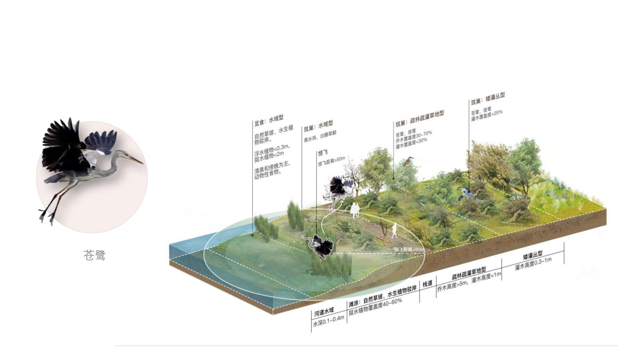 森林节点融合生态与游憩活动,营造丰富的空间变化;利用海绵系统进行雨水消纳,处理农田面源污染;并通过种植设计为鸟类提供食源和休憩场所,形成人鸟和谐图景。