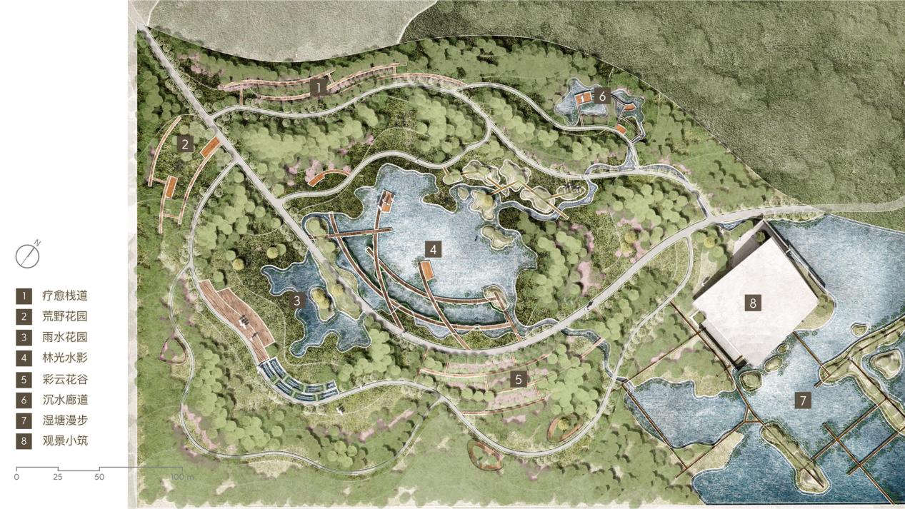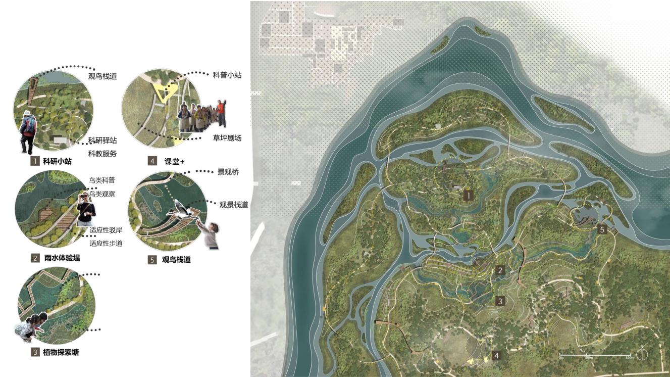 湿地节点内包括科研小站、雨水体验堤、植物探索塘、课堂+、观鸟栈道等景观点位。区域内根据场地中的鸟类活动空间需要设置缓冲区,促进鸟类保护与自然教育活动的平衡。