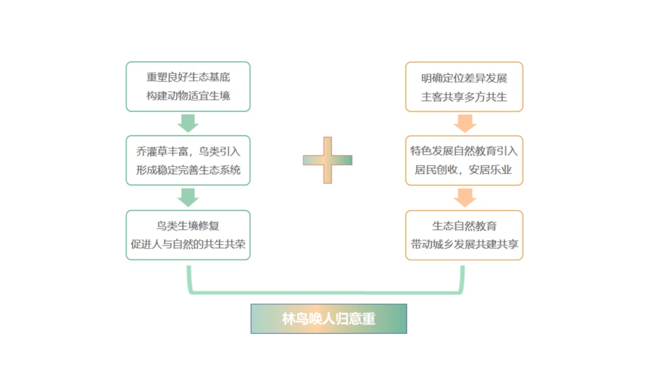 经前期分析,小组进一步明确了规划方向以及目标,并提出核心的概念。潮白河的荒凉让我们印象深刻,场地最为缺乏的是活力,不仅仅是自然的生机勃勃,还有人类与自然的共生共存。小组希望通过通过修复鸟类生境,使生境和动物协同发展,达到林地保育、水生态保育、生态农业发展、鸟类生境修复四大生态目标;希望通过自然教育的策划,串联林、水、田、村四类空间,架起人与自然之间的桥梁。于是最终提出“以鸟类生境修复促进人与自然的共生共荣,以生态自然教育带动城乡的共建共享”的发展目标,从而由此发展出“林鸟唤人归意重”的设计理念。即希望自然的生机勃勃能带领人们重回这片沃土。