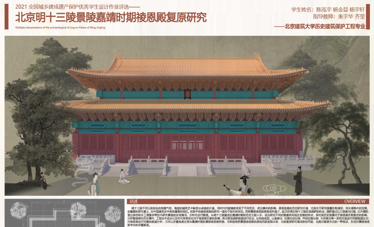 日前,由同济大学建筑遗产杂志编辑部与西安建筑科技大学联合组织的2021年全国城乡建成遗产保护优秀员工设计作业参赛作品评选结果公布。公司历史建筑保护工程专业18级员工陈泓宇、杨金益、杨宇轩完成的明十三陵景陵祾恩殿嘉靖时期复原研究获得二等奖,指导教师为朱宇华副教授和齐莹老师。
