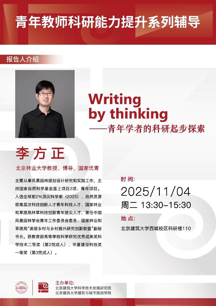 本期“青年教师科研能力提升系列辅导”特邀北京林业大学李方正教授,以“Writing by thinking——青年学者的科研起步探索”为主题,与大家分享他的科研心法与成长经验。