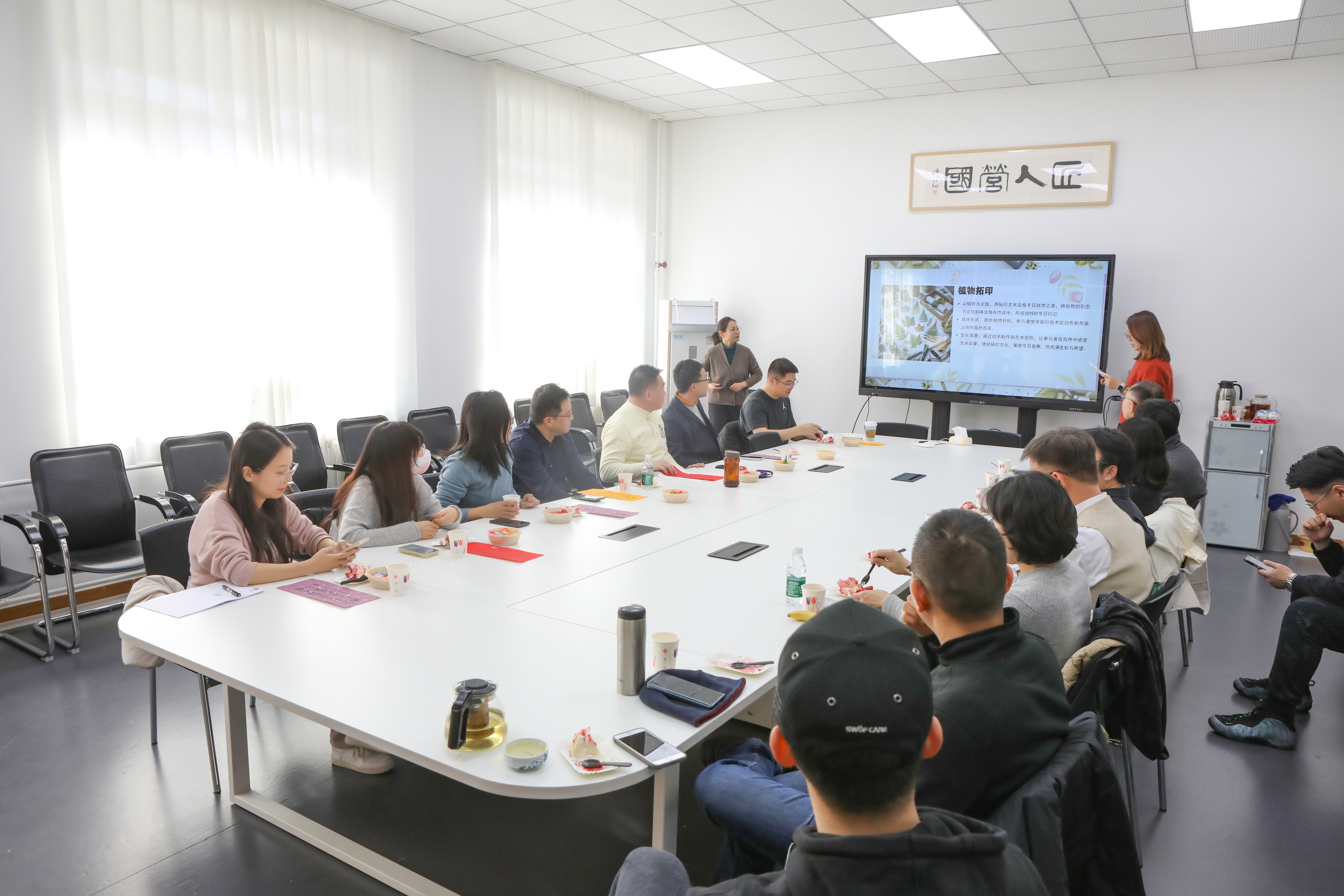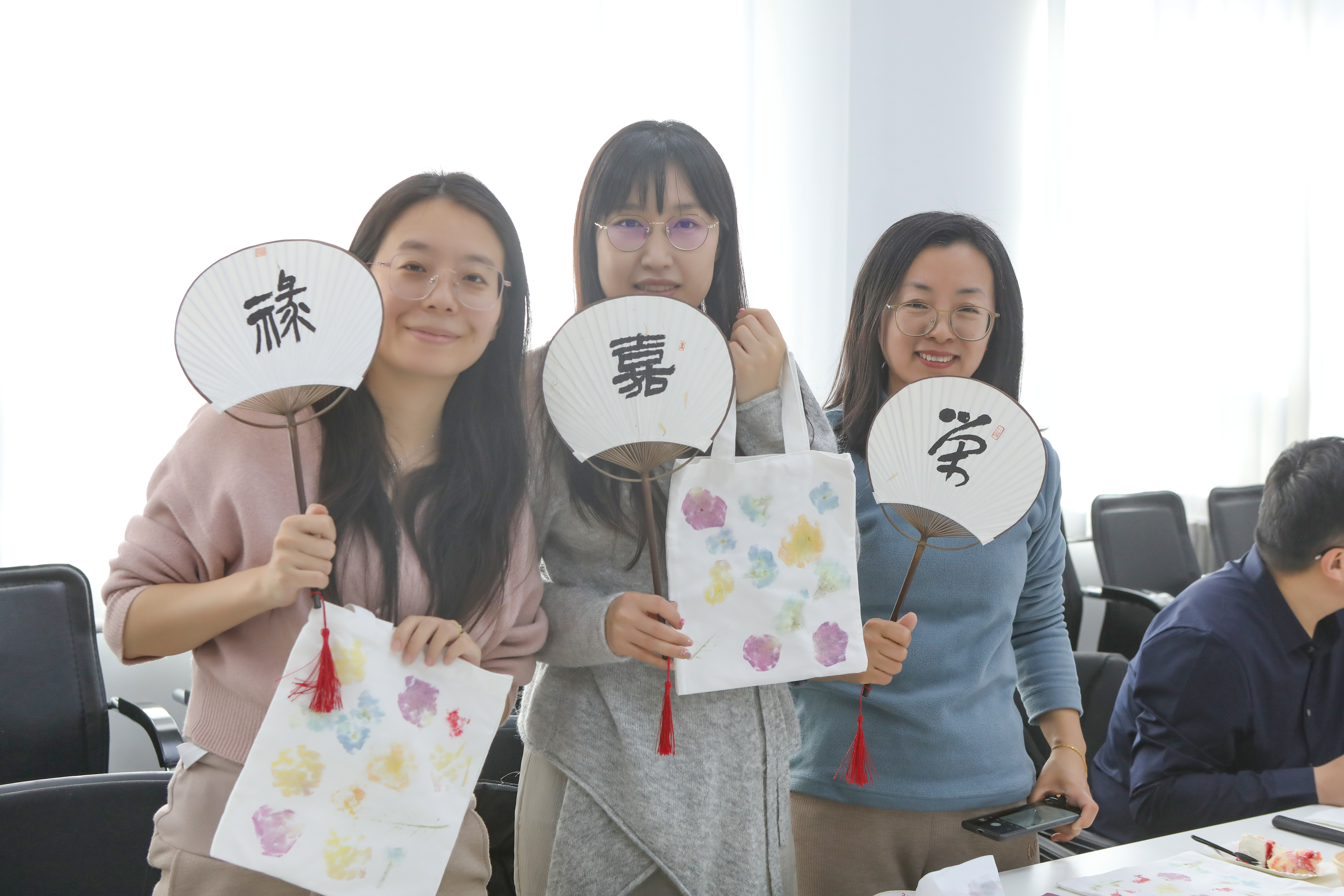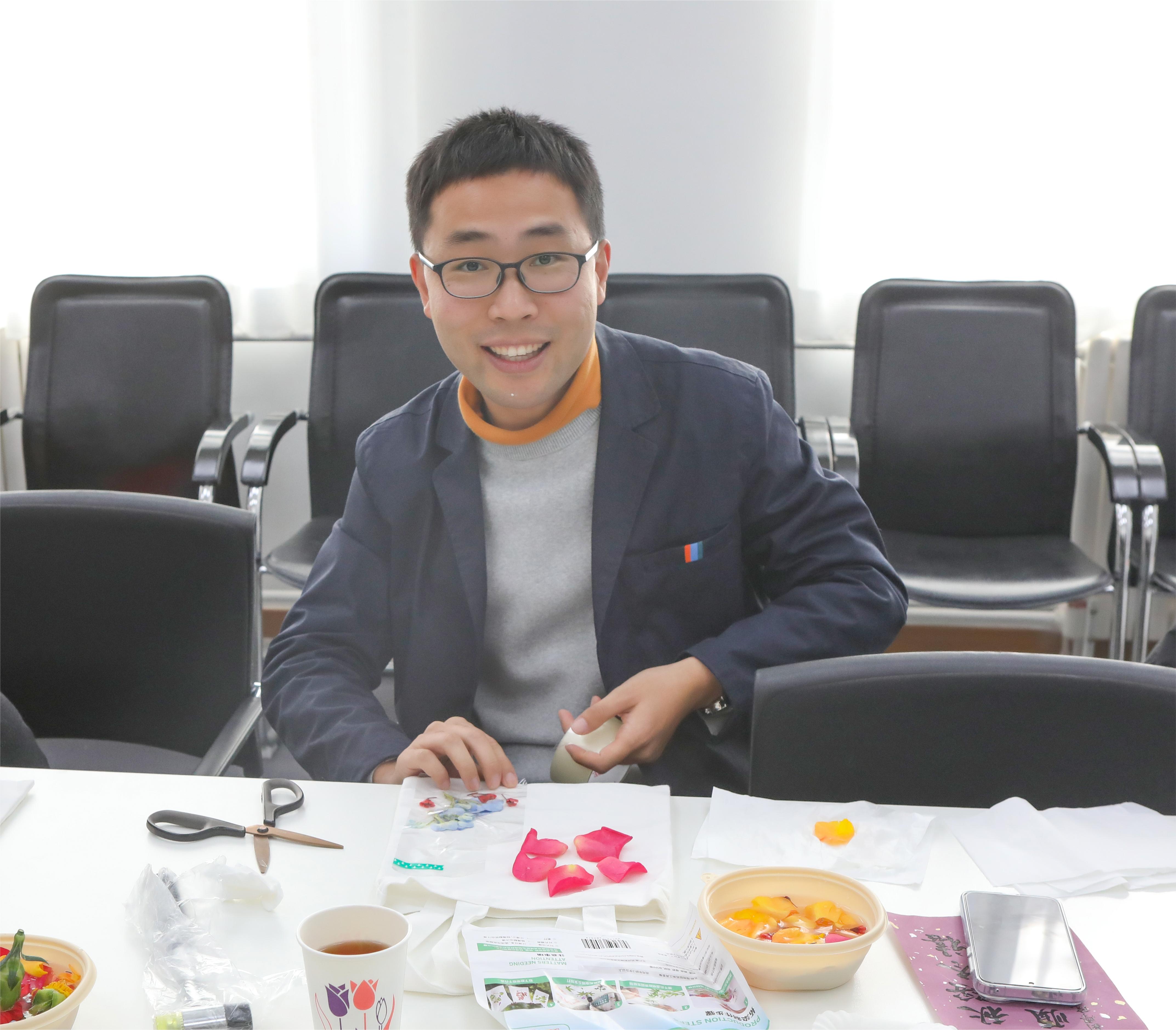 祝福仪式之后,我们迎来了生日会的第一个互动环节——植物拓印活动。参与老师以植物为材料,在帆布袋上通过拓印技术创作艺术图案。