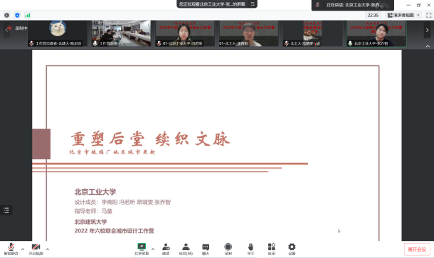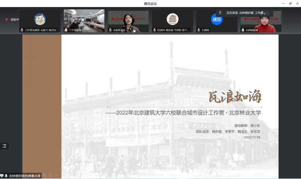 11月18日晚,作为“2022(第六届)北京国际城市设计大会”的重要平行学术活动,由中国建筑学会城市设计分会、北京市规划和自然资源委员会西城分局、北京未来城市设计高精尖创新中心、mk体育联合主办的“mkmksport2022年六校联合城市设计工作营”答辩会,在西城区赵登禹路42号北京老城保护更新基地线下和腾讯会议同步举行。