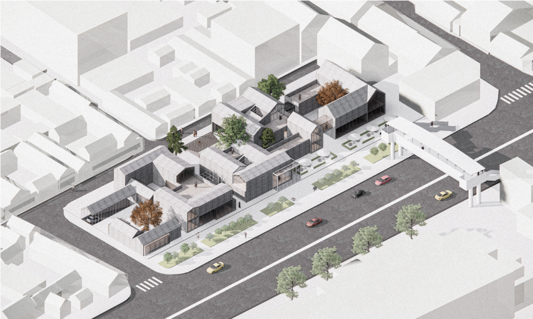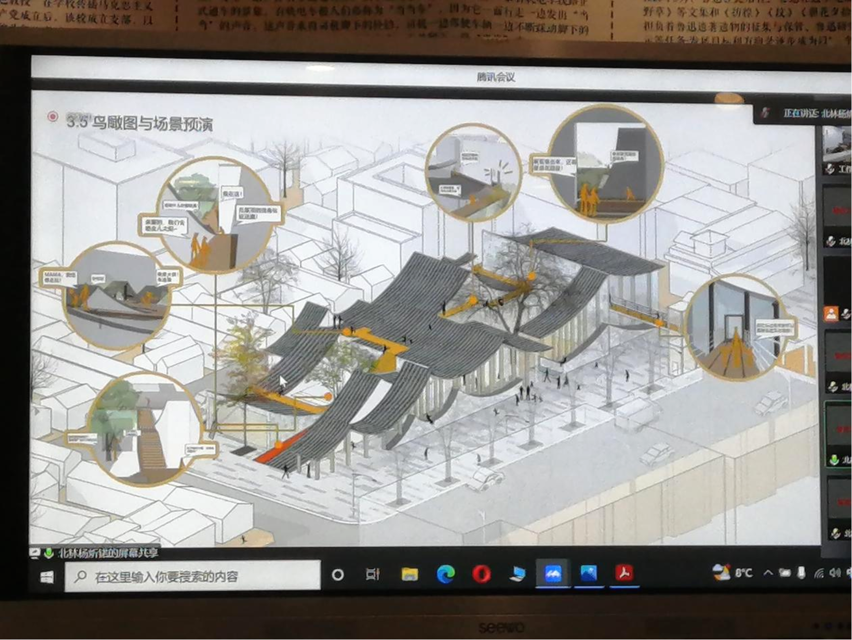 然后是进入答辩环节。答辩会采用抽签的方式确定了各校团队的答辩顺序。在汇报环节中,北京工业大学团队以“重塑后堂,续织文脉”为题,引入“后堂”理念,通过对周边环境的分析,推导建筑形态的生成。清华大学团队以“玲珑市街,琉璃合院”为题,通过历史脉络的分析,制定自上而下的更新策略,探讨新型城市多元人群活动下的多合院体系设计。北京林业大学团队以“瓦浪如海”为题展开设计,强化天桥与建筑的连接,营造趣味性和诗意性的游园空间。mkmksport团队以“织补城市,重塑活力”为题,呼应历史街区尺度,织补城市肌理,依据城市发展与居民日常需求,植入复合功能。北方工业大学团队以“共享·共生·共创 琉璃印象·画卷”为题,从联系道路、新型业态、共享空间三方面策略入手,设计文化艺术交流中心。中央美术公司团队则以“隐于市,市于隐”为题,以建筑公共性为线索,探讨了与市井活动场景相结合的文化市集设计。与会评委专家老师对各校的成果进行了精彩的点评。