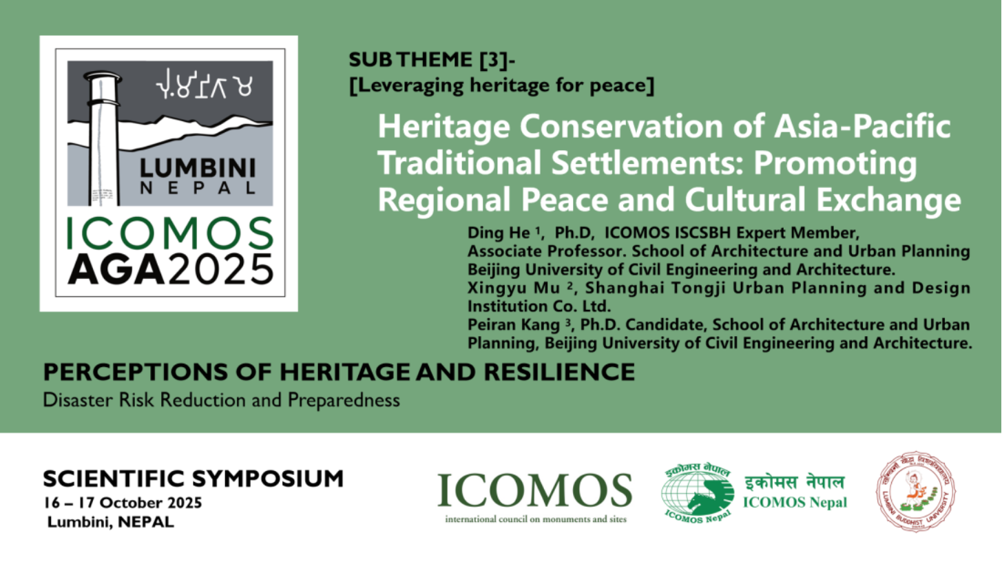 在为期两天的会议中,mk体育贺鼎副教授团队受邀参加“以遗产促和平(Leveraging Heritage for Peace)”子议题。演讲题目为:Heritage Conservation of Asia-Pacific Traditional Settlements: Promoting Regional Peace and Cultural Exchange(亚太地区传统聚落的文化遗产保护:促进区域和平与文化交流)。报告由mk体育贺鼎副教授、同济城市规划设计研究院穆星宇高级工程师和mk体育博士生康佩然,于尼泊尔时间2025年10月17日16:30–16:40线上进行。