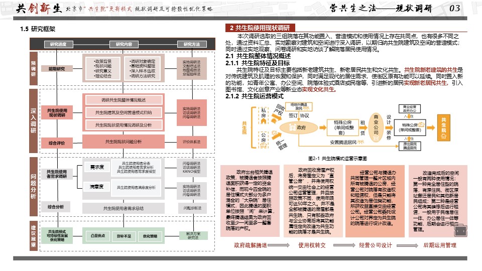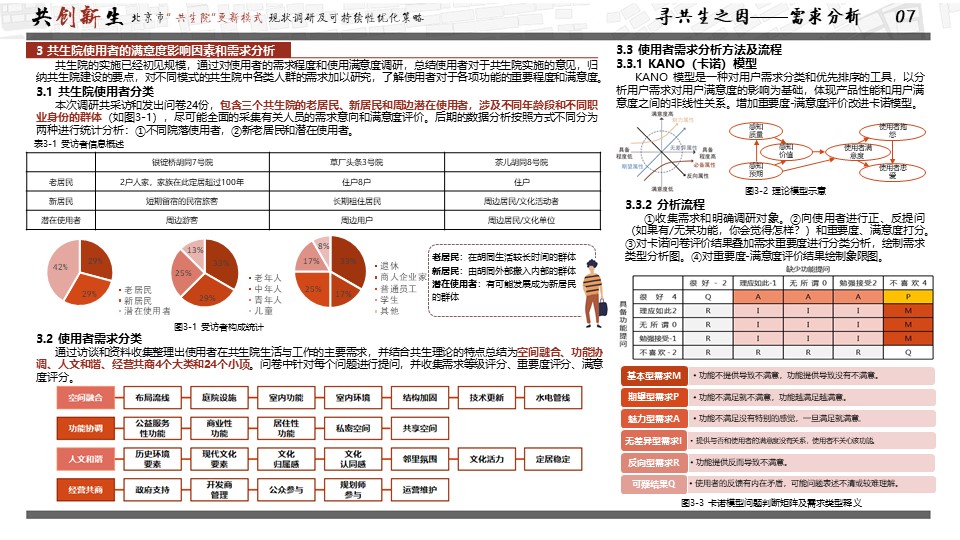 获奖作品聚焦首都城市更新问题,以可持续发展理念为研究视角,探究“共生院”与城市可持续发展的关系,并通过实地勘察、资料汇总、采访访谈对现有共生院院落的使用现状进行调研,并通过问卷调查、KANO模型分析等方法分析使用者需求、影响要素及现存问题,进而提出共生院可持续发展的优化策略,以期“共生院”模式更好发挥引领示范作用,实现可持续发展。
