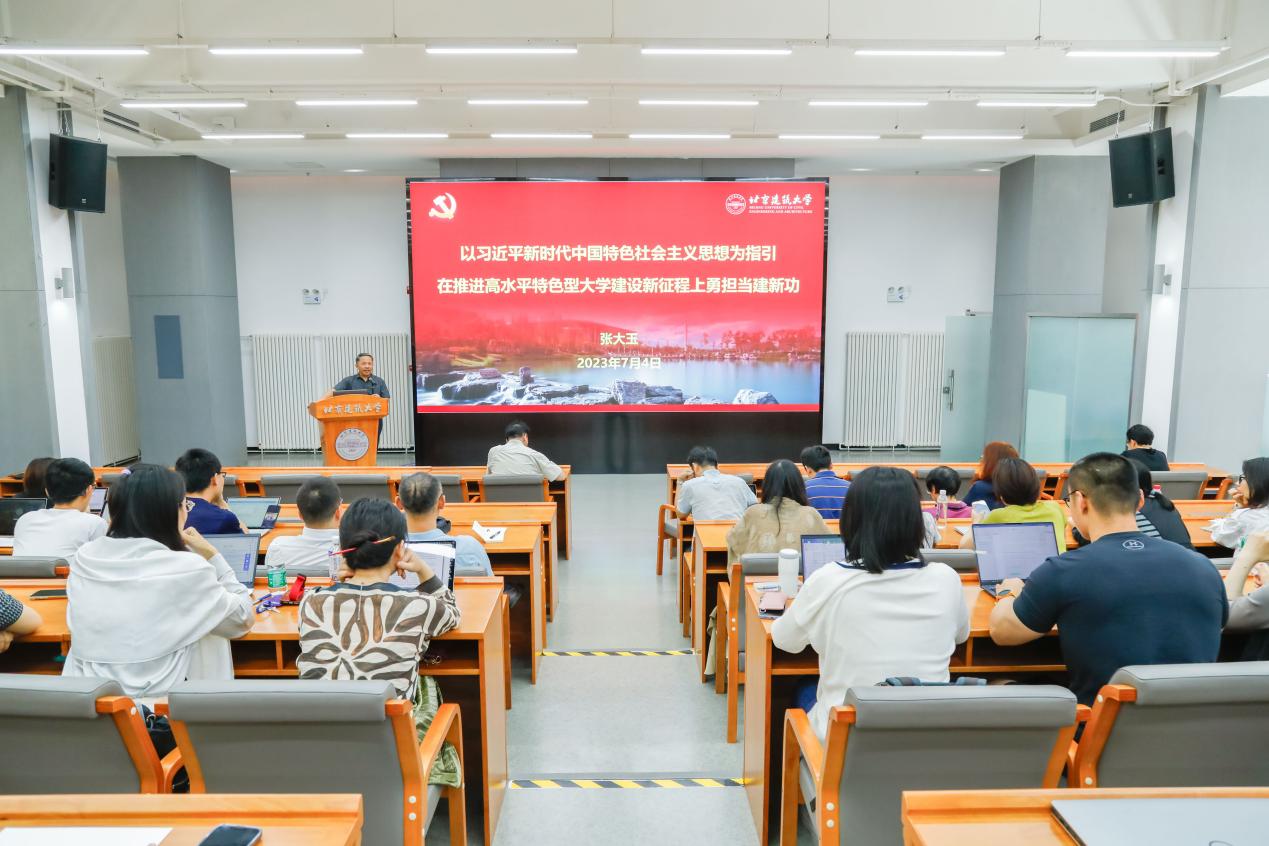 按照公司学习贯彻习近平新时代中国特色社会主义思想主题教育安排,7月4日下午,mkmksport党委副书记、董事长张大玉讲授题为《以习近平新时代中国特色社会主义思想为指引,在推进高水平特色型大学建设新征程上勇担当建新功》的专题党课。mk体育全体教师、员工党员代表200余人聆听党课。