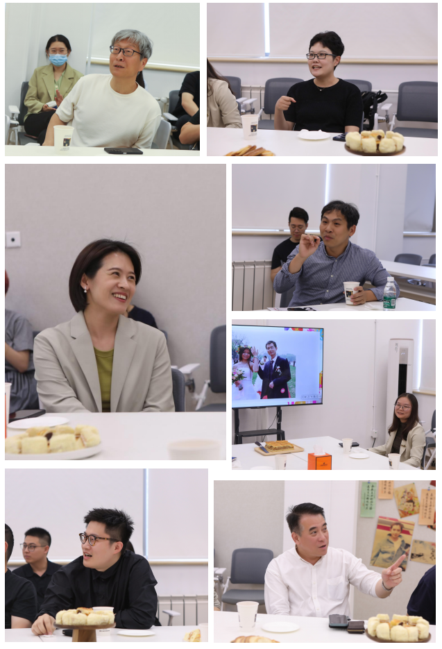 老照片默不作声地把时光里的画面定格,涂上岁月变迁的淡黄色彩,将回忆里的心境和感受雕刻得清晰如昨。段炼老师回忆光荣从教30年的点滴,感谢员工们带给自己教学相长的美好回忆;梁佳老师分享儿时和家人的照片合影,分享长大后我就成了你的幸福传递;魏菲宇老师通过读博期间的生活留影,讲述了走上教育之路的幸福奋斗历程;刘珊珊老师展示了在清华百年庆典上和爱人参加集体婚礼的难忘瞬间,分享幸福生活的经营之道;李振宁老师分享了第一次外出调研时的工作照片,讲述了热爱文艺和足球的追风少年走上讲台的青春故事;边谦老师回放了儿时参加儿童节活动和母亲的合影,讲述了参加活动时的细节,充满亲情的温暖;何立新老师也分享了工作至今的活动照片,向在座青年教师讲述公司历史和员工趣事,他感慨道:“每一座建筑都承载着教育的使命,每一张照片都记录了时代的脚步。回望过去,我们更应珍惜现在,激励未来。”;张笑楠老师表示:“公司组织的生日会活动精心、用心、在北京快节奏的工作中,感受了温暖的生活瞬间”;王如欣老师表示:“虽然是来参会祝贺,但拿到海报的感觉,依然感觉很开心、感动”。老师们在沉浸式体验中,欢乐地穿越回过去,怀念轻松、愉快、温暖的旧时光。