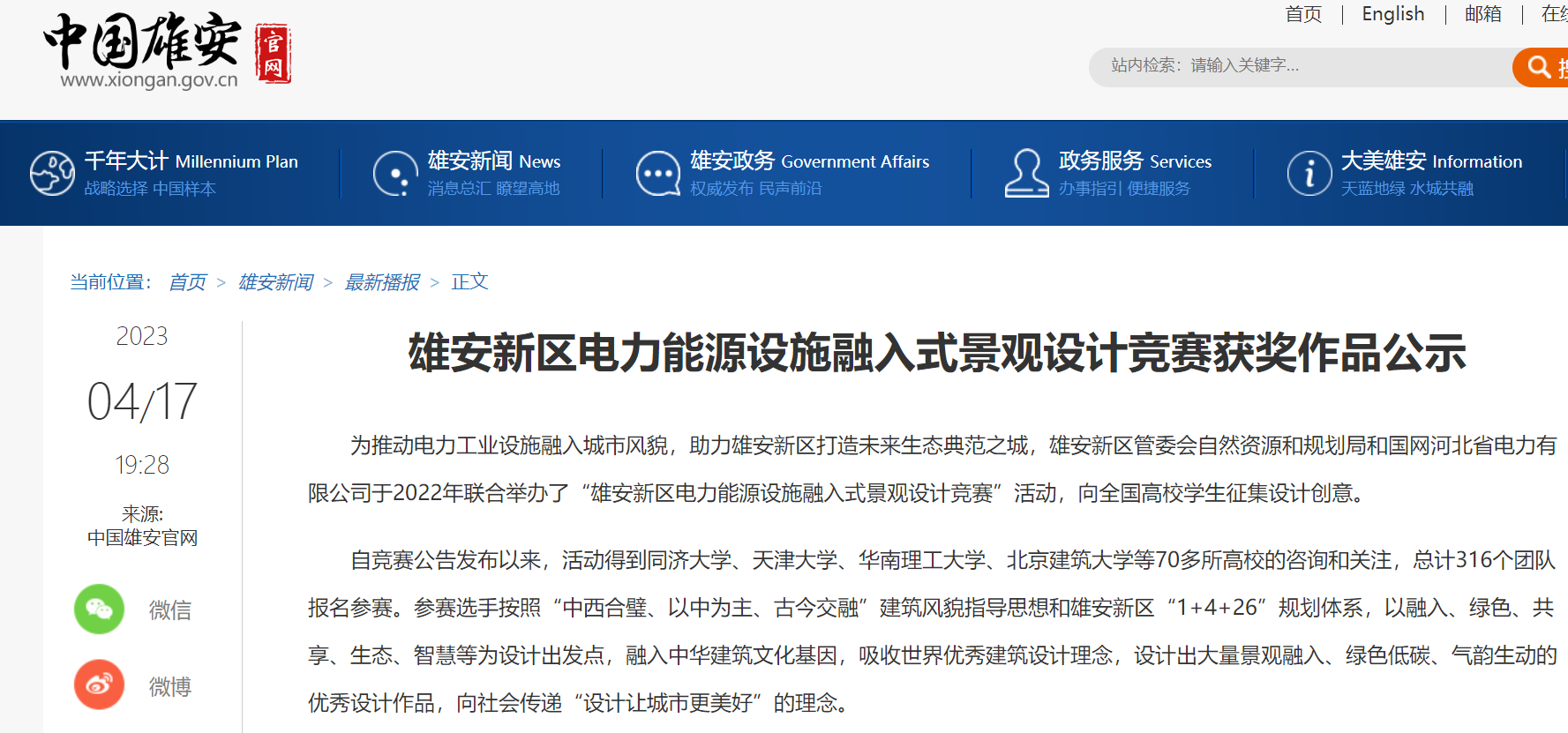 2022年,为推动电力工业设施融入城市风貌,助力雄安新区打造未来生态典范之城,由雄安新区管委会自然资源和规划局和国网河北省电力有限公司联合举办了“雄安新区电力能源设施融入式景观设计竞赛”活动,选取雄安新区6座、石家庄市2座变电站作为竞赛设计标的,围绕变电站及其周边景观设施向全国高校员工进行设计创意征集。要求参赛选手按照“中西合璧、以中为主、古今交融”建筑风貌指导思想和雄安新区“1+4+26”规划体系,以融入、绿色、共享、生态、智慧等为设计出发点,融入中华建筑文化基因,吸收世界优秀建筑设计理念,设计出大量景观融入、绿色低碳、气韵生动的优秀设计作品,向社会传递“设计让城市更美好”的理念。