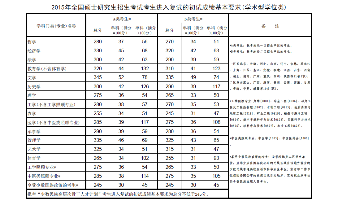 2015年全国硕士研究生招生考试考生进入复试的初试成绩基本要求(学术学位类)